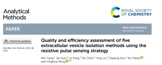 [1] Yang M, Guo J, Fang L, et al. Quality and efficiency assessment of five extracellular vesicle isolation methods using the resistive pulse sensing strategy. Anal Methods. 2024;16(32):5536-5544. Published 2024 Aug 15. doi:10.1039/d4ay01158a