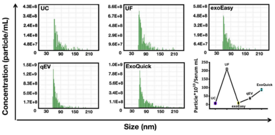 Particle Size Distribution: UC, UF, ExoEasy, and qEV methods yielded EVs with consistent sizes around 71 nm. In contrast, ExoQuick produced slightly larger vesicles, averaging 77 nm.