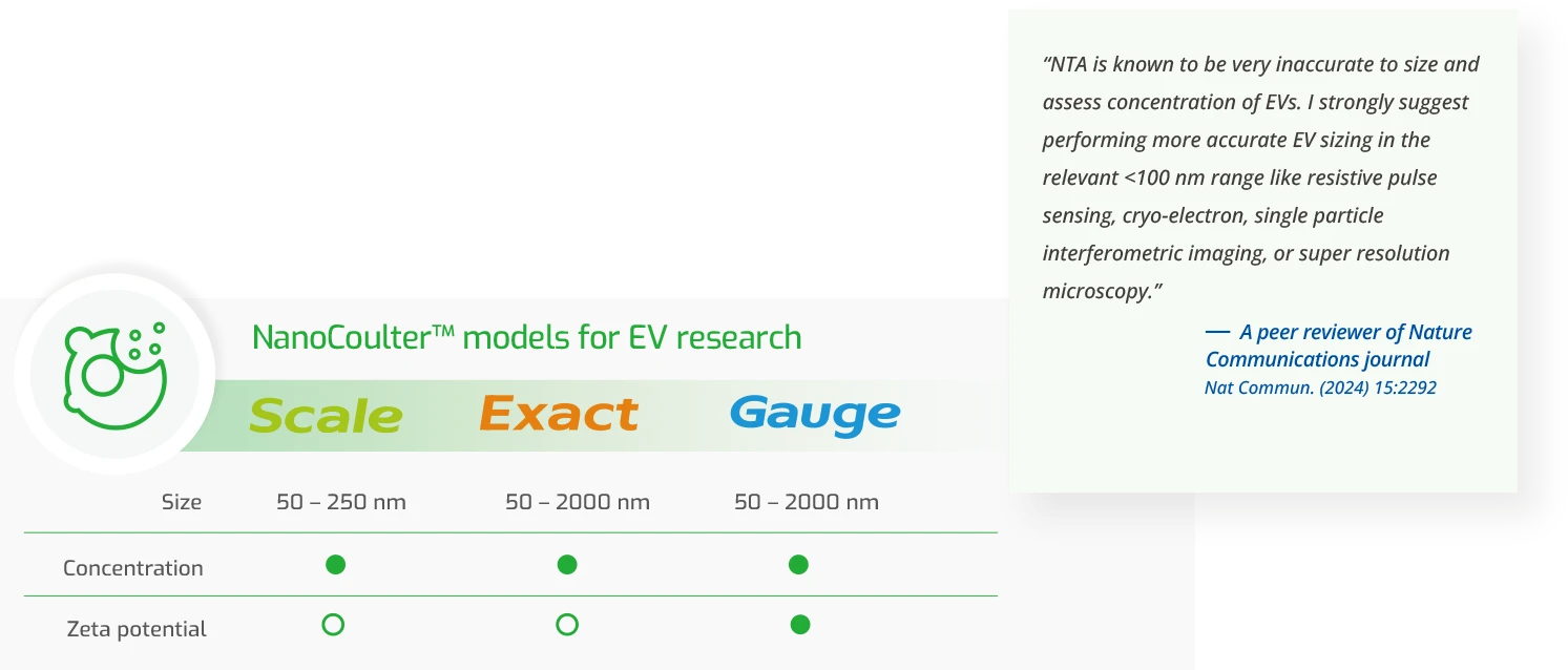 Exosomes are membrane-bound vesicles released by cells that mediate intercellular communication and have potential for clinical applications such as monitoring disease progression and drug delivery. However, their broad size distribution, including larger vesicles, challenges traditional detection methods, which often fail to capture the true size distribution. Nanocoulter™, with its precise and reproducible single-particle detection, offers new possibilities for advancing extracellular vesicle (EV) research.