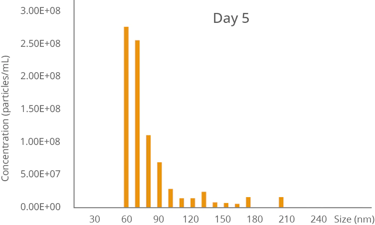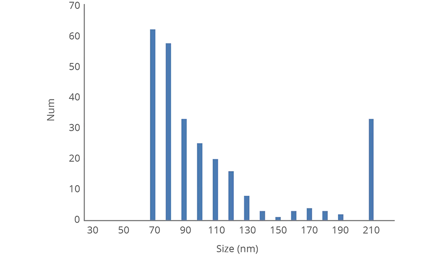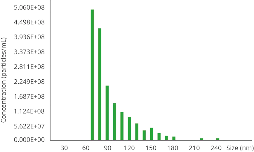 The graph below shows the analysis of an exosome sample measured using Nanocoulter™. A clear bimodal distribution is visible, with the majority of particles falling between 70–90 nm, closely matching exosome size data obtained from electron microscopy studies.