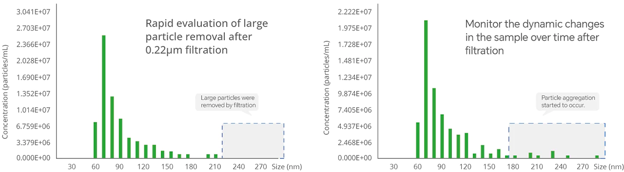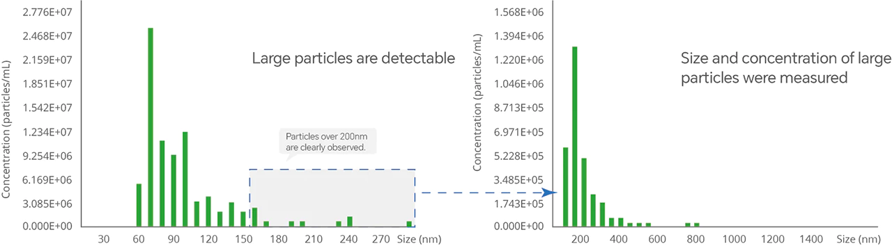 NanoCoulter™ enables precise measurement of large vesicles in EVs samples. By utilizing nanochips with different measurement ranges, it can determine particle concentrations across various size ranges. With its ultra-high sensitivity for single-particle detection, NanoCoulter™ swiftly identifies subtle changes before and after sample treatment, significantly accelerating the research and development of EVs.