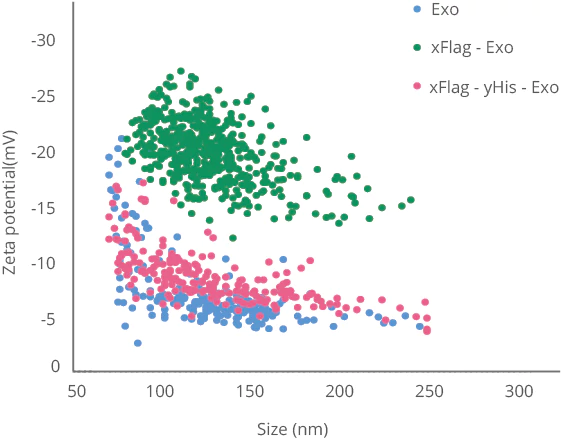 Exosome surfaces were modified with (x)Flag-tag and (y)His-tag, respectively, to modulate the stability and targeting ability of EV-based drug delivery vehicles. NanoCoulter™ enables clear characterization of the changes in zeta potential before and after surface modification.